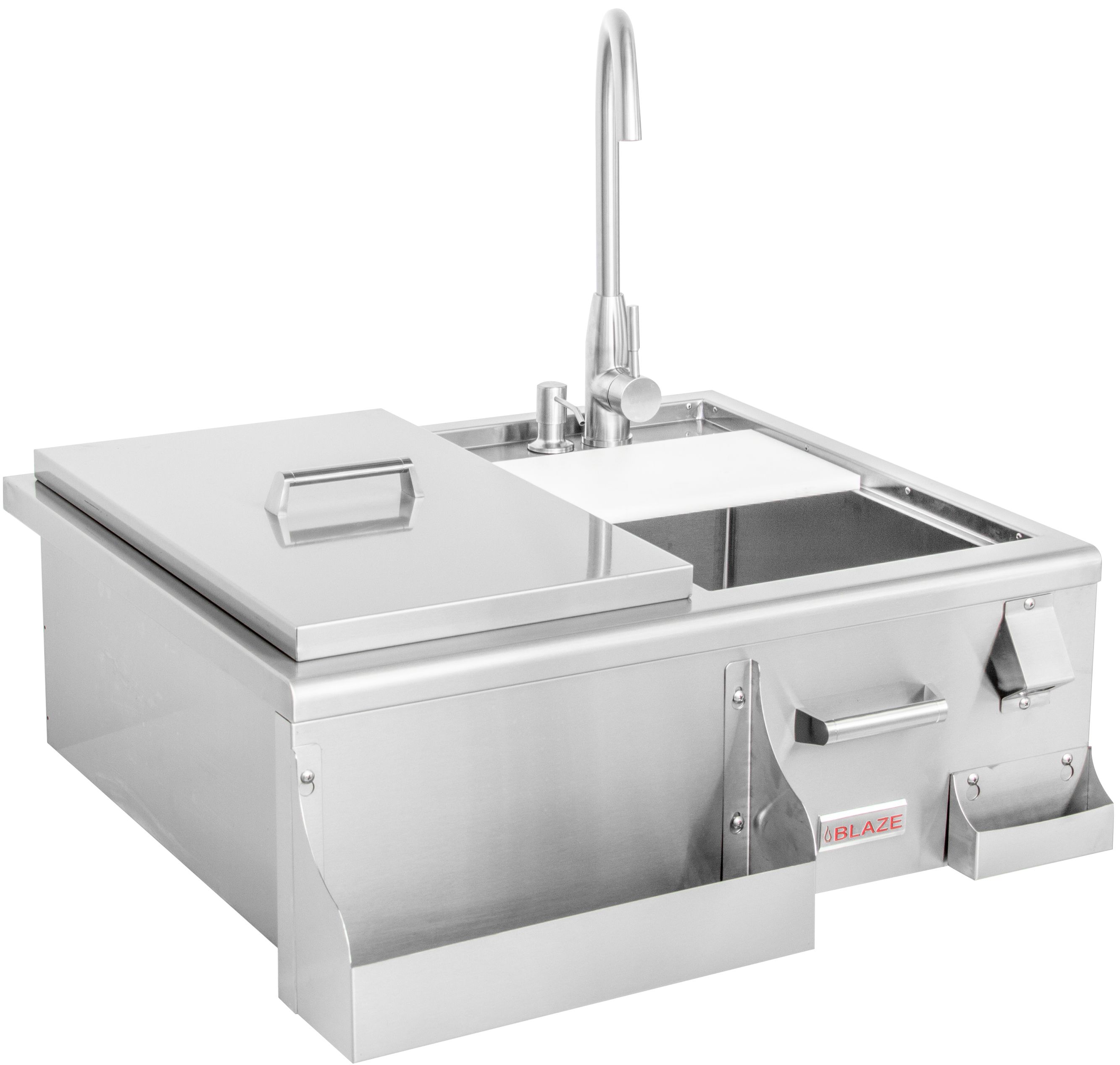 The Blaze Beverage Center was designed with both style and usability in mind. For quick and easy access, there is an attached bottle opener, a built-in soap dispenser, a front bottle storage and a removable three-part condiment tray. Plus, Blaze includes a cutting board that slides across the sink and can be removed for extra space. Made from 304 stainless steel, this beverage center is both durable and stylish with a sleek design and curved edges. This beverage center fits perfectly in any outdoor kitchen.Read More