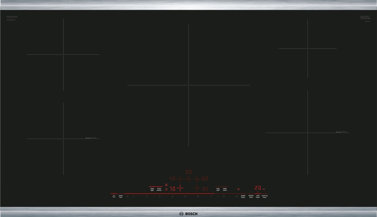 Step up to Bosch Induction. Choose a streamlined look and precise performance of a Bosch induction cooktop. 800 Series cooktops offers consistent element temperature settings for more precise cooking results using AutoChef®. Bosch cooktops can be installed in a frameless design to integrate more seamlessly with the countertop or a stainless steel framed design to stand proud. Speed up dinner for more moments to savor. Sometimes you don't want to wait for a pot of water to boil. The SpeedBoost™ function on Bosch induction cooktops adds even more power to speed up the cooking process. So you can boil water twice as fast as conventional electric cooktops.