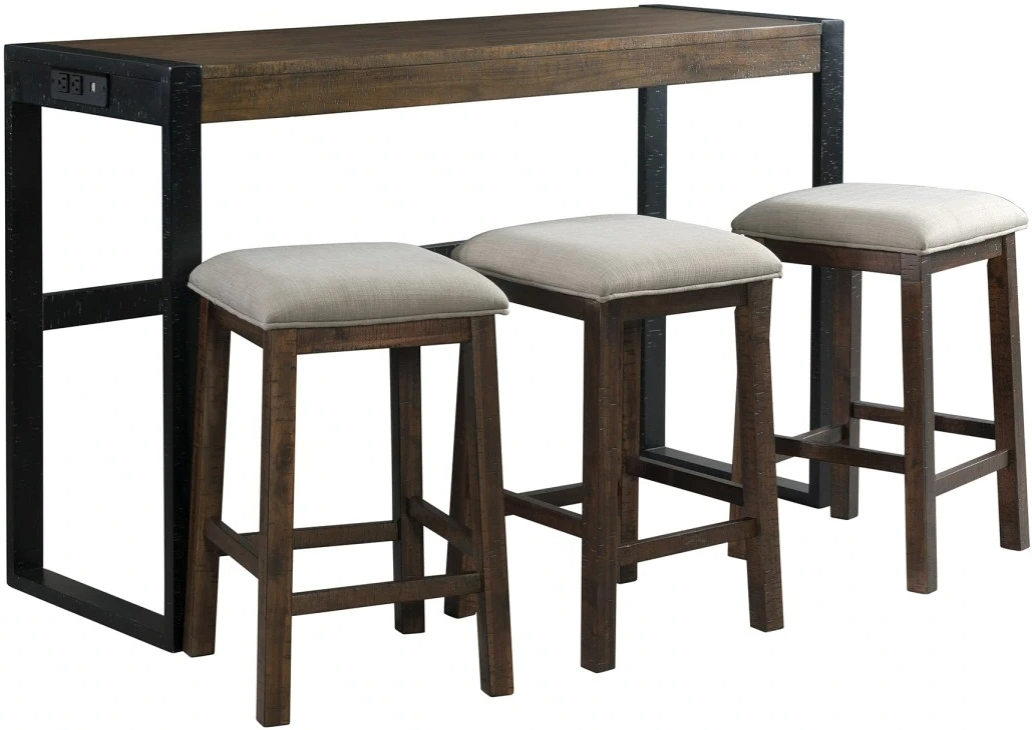The barstools are upholstered with Taupe fabric, and a foam cushion seat; which enhance your comfort when just sitting finishing up work or watching TV. Also, distressed markings can be found throughout the entire set which gives this piece that rustic vibe you have been looking for. Another amazing feature this set offers is a USB and plug outlet. The days of having to stretch your power cord from the wall to your table are long gone! So grab your laptop and set up shop with this amazing bar table set.