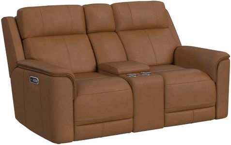 The Mustang Power Motion Loveseat outfits your living space with unmatched comfort. Fully upholstered in 100% top-grain leather and amply padded with soft foam cushioning, this piece is designed to elevate your moments of repose. Power recline, headrest, and lumbar function combine to enhance comfort, while an integrated controller with a USB port and a storage console with 2 metal cupholders add modern convenience. Minimal decorative tufting and stitchwork add refined stylistic elements, perfectly complementing the understated, timeless design. For a comfortable and durable addition to your living space, choose the Mustang Power Motion Loveseat.